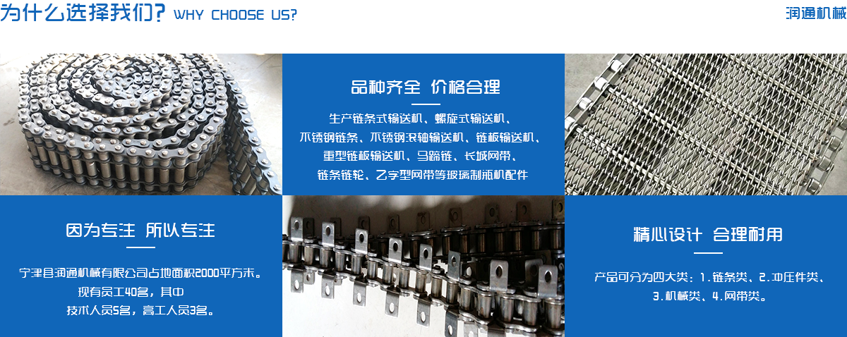 生產鏈條式輸送機、螺旋式輸送機、不銹鋼鏈條、不銹鋼滾軸輸送機、鏈板輸送機、重型鏈板輸送機、馬蹄鏈、長城網帶、鏈條鏈輪、乙字型網帶等玻璃制瓶機配件,食品機械配件及各種網帶的專業廠家 ,多年來產品暢銷各地玻璃廠和食品廠,在玻璃制品等行業中享有較高的聲譽。公司集摸具開發、機械設計生產,銷售于一體的生產型企業。生產的自動化流水線金屬傳動網帶、鏈條等產品廣泛用于玻璃機械、食品機械、化纖機械、醫藥、電子、烘干機械、輪胎機械等行業。產品多銷往各個城市的機械廠、食品廠和一些涉及流水線或自動化設備的公司。